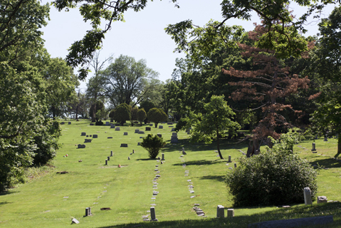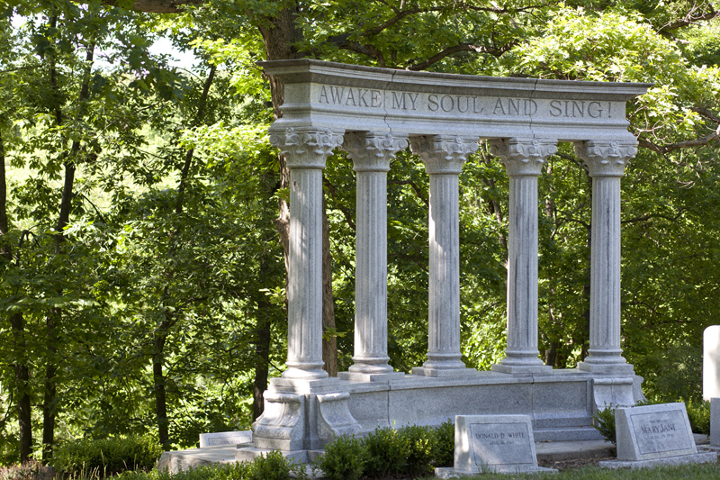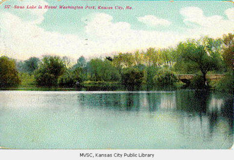 Once upon a time, Mount Washington was underwater. In 1886, fifteen years before the cemetery’s founding, Washington Amusement Park stood in its place. The park’s owner, Willard Winner, a visionary real estate tycoon and president of the Kansas City Independence Railway — called the “Dummy Line” because its engines were draped with canvas so as not to scare horses — envisioned a swimming and boating lake as the center of his woodland fantasy land. Winner damned a creek which ran through his property and flooded twenty of his twenty four hundred acres. In the resulting reservoir, he anchored a broad-decked showboat and built a bandstand on a small island at the center of the waters. The park soon played host to the revues of popular acting troupes and many of the country’s best brass bands. On a summer’s evening in 1887, the melodies of the Stephen Foster songbook could be heard echoing through the woods of Independence.