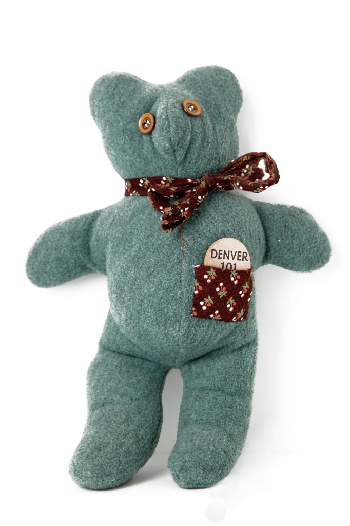 The bear was made by Mastie. She made a whole bunch and donated them to her local police force. They kept a bear in their trunk to give to children who had experienced traffic accidents or crime. They all have a wooden Indian nickle in the pocket. I have no idea where she got wooden nickles, but she always had a bunch.