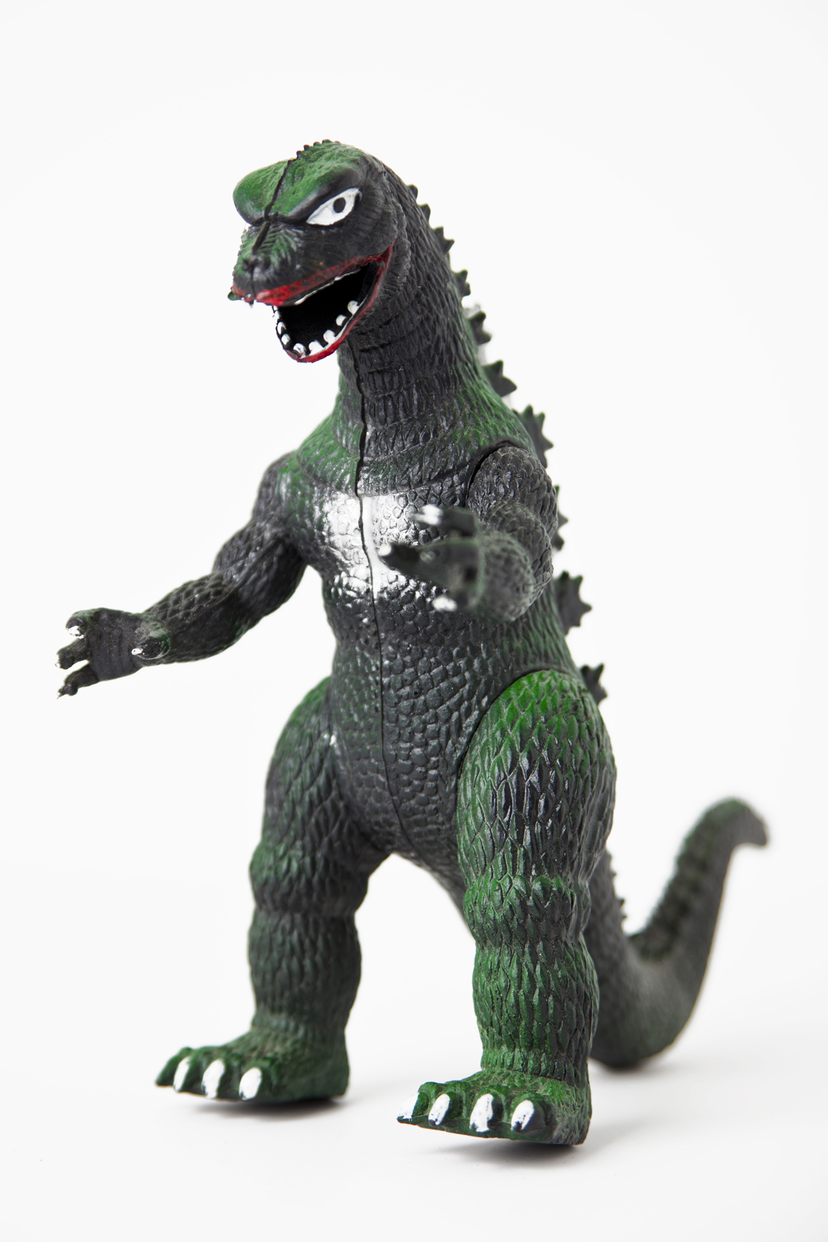 I like that this Godzilla is as basic as a Godzilla toy can be without being rendered worthless by being molded without joints. This Godzilla moves exactly as much as he needs to, and his tail is broad and low enough to keep him from toppling over easily. His mouth is open just enough for him to spit fire, eat fools or scream in rage or pain depending on his role in the play session. If it were open more or less, it’d overstep its bounds as a vector for play by dictating a context. There aren’t any super-specific features to him that work only in a single context during play (see: those awful action figures from our childhood that would lift their arms to simulate punching or whatever when you’d squeeze their legs together, like I couldn’t have just put his arm there myself. Plus, whatever mechanism allowed this action feature to function made both the legs and the punching arm largely unusable for most other poses, as it restricted their user-preferred use for the sake of the manufacturer’s predetermined function), but you’re not left wanting for anything more Godzilla-y out of him. You want something else? Go get another toy, kid. We didn’t even pay Toho a license fee when we made this thing.