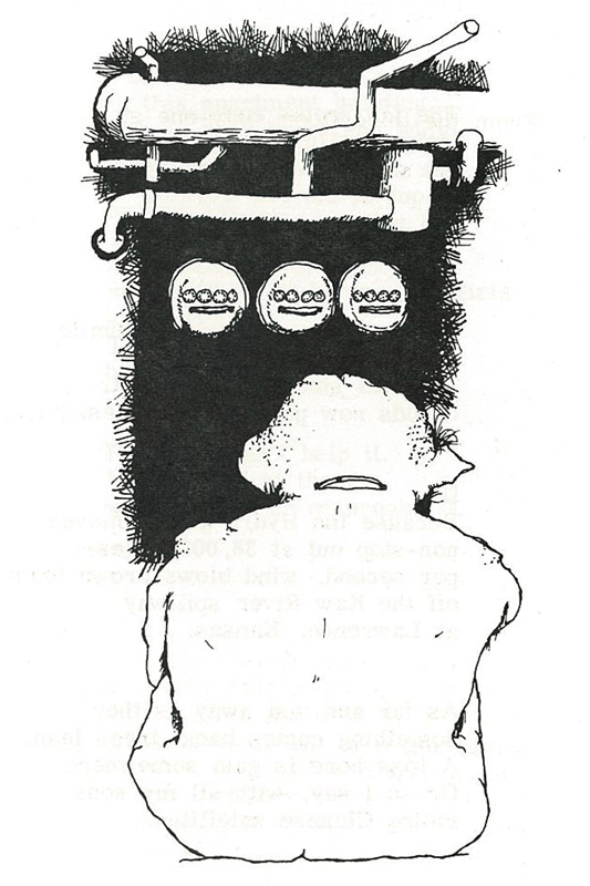 To make the Kawsmouth/Chouteau collection official, we’re including a scan of “Electric Bill” in this issue as well as the accompanying drawing by Mark Roeyer. We’re doing so with the implied permission of Cottonwood Press, which published Perkins’ and Roeyer’s chapbook, Midget Wonder, in 1971. If anybody has any objections or further information, please let me know. And if decades from now you come across my poems in some fusty closet or cached-out corner of the Internet and would like to publish one of them somewhere, please be my guest.