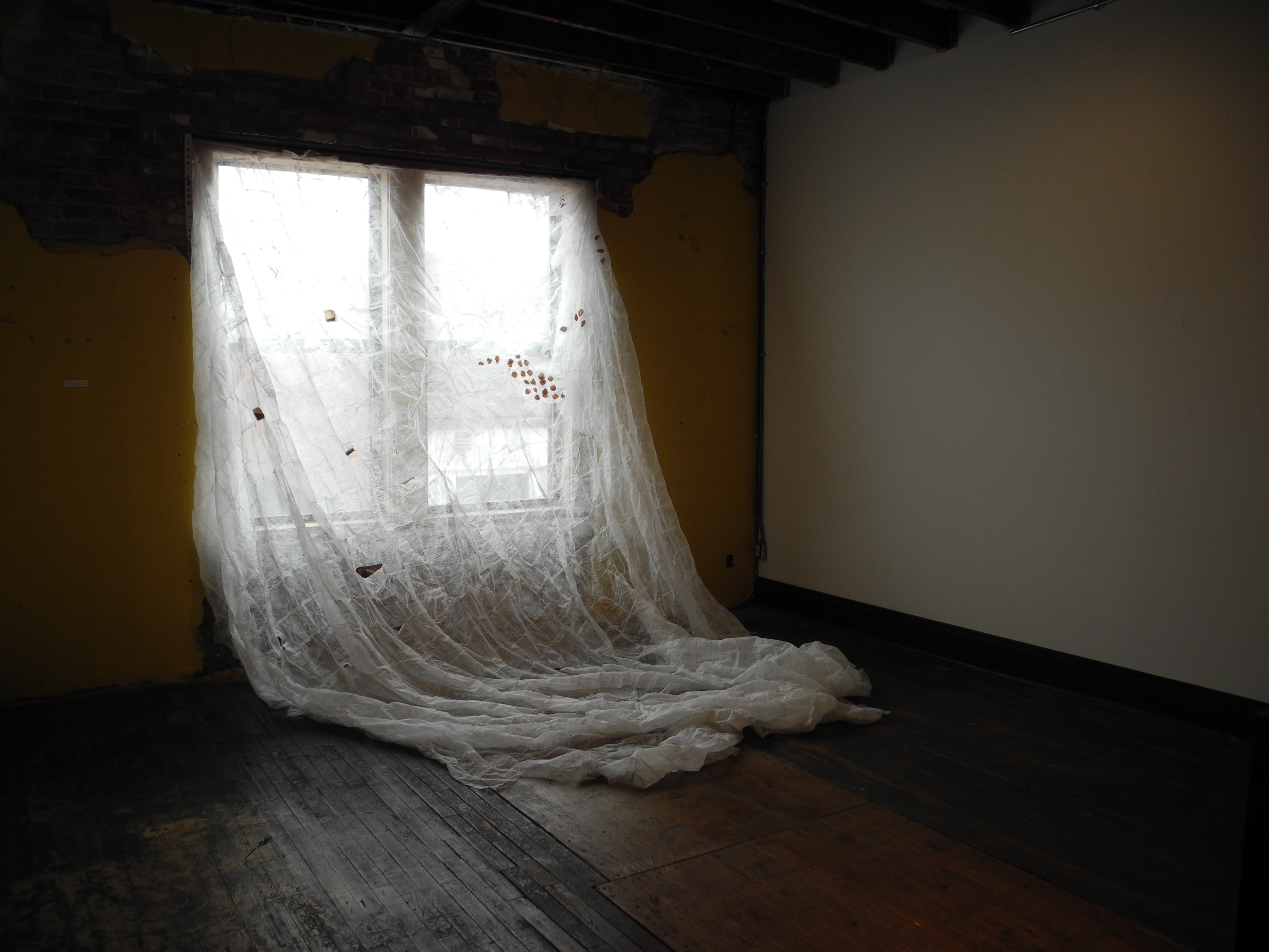 The intricate threadwork of the curtain looked like a bridal veil woven by spiders, stirred by the slightest wisp of nuclear winter, microfiber gossamer undisturbed by time or visitors. I knew from having just examined it up close, however, that the cloth was actually made of hundreds of dryer sheets that the artist had hand-stitched together with fishing line, a smattering of rose petals and tea bags sporadically suspended in its filaments.